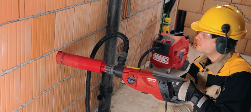 - Ainutkertainen Hilti X-CM -vaihtomoduulijärjestelmä (halkaisija 52-202 mm) mahdollistaa poraussydämmen helpon poistamisen, kiinni juuttuneen porakruunun nopean irrottamisen ja kärjen uudelleen käsittelemisen työkohteessa vain tasapäistä ruuvimeisseliä käyttäen