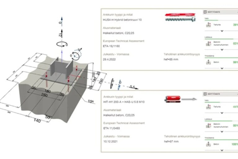 HUS4 Hybridin asentaminen on monin verroin nopeampaa perinteiseen kemialliseen ankkuriin verrattuna, koska asennus onnistuu ilman erikoistyökaluja, eikä vaadi asennusmomenttia tai porareiän puhdistusta. Perinteisen kemiallisen ankkurin toiminta perustuu sitomiseen ja vaarnan muotoon. Kiinnityksen turvallisuuden kannalta on siksi erittäin tärkeää, että asennus tehdään teknisesti oikein ja porareikä puhdistetaan huolellisesti ennen asennusta. Yleisin virhe työmaalla on, ettei reikää puhdisteta tai se puhdistetaan puutteellisesti, jolloin kiinnityksen kapasiteetti voi heikentyä jopa 80 %. Ajansäästön lisäksi hyväksyntä puhdistamattomaan reikään takaa, ettei HUS4 Hybridillä synny samanlaista riskiä kapasiteetin alenemiseen kuin kemiallisilla ankkureilla, vaan toteutus onnistuu kuten on suunniteltu. Käyttöä työmaalla helpottaa yhteensopivat tuotteet – kapseleita löytyy eri kokoja (10/12/14), joita käytetään aina vastaavan kokoisen HUS4-betoniruuvin kanssa. Sovelluksesta ja käyttökohteesta riippuen HUS4-betoniruuveja on testattu eri pinnoite- ja viimeistelyvaihtoehdoilla. HUS4-MAX-kapselin sisältämä kemiallinen polymeerimassa kuivuu erittäin nopeasti ja ankkuri on heti kuormitettavissa asennuksen jälkeen, mikä lisää työmaajoustavuutta entisestään. Rajoituksia porausmenetelmän suhteen ei ole, sillä tuote on hyväksytty kaikilla menetelmillä. Kuten HUS4-betoniruuvi, myös HUS4 Hybrid on säädettävissä asennuksen aikana ja ankkuri voidaan tarvittaessa kokonaan poistaa massasta huolimatta. Samaa porareikää voidaan myös hyödyntää uudelleen kapselin kanssa ilman vaikutusta kapasiteettiin.