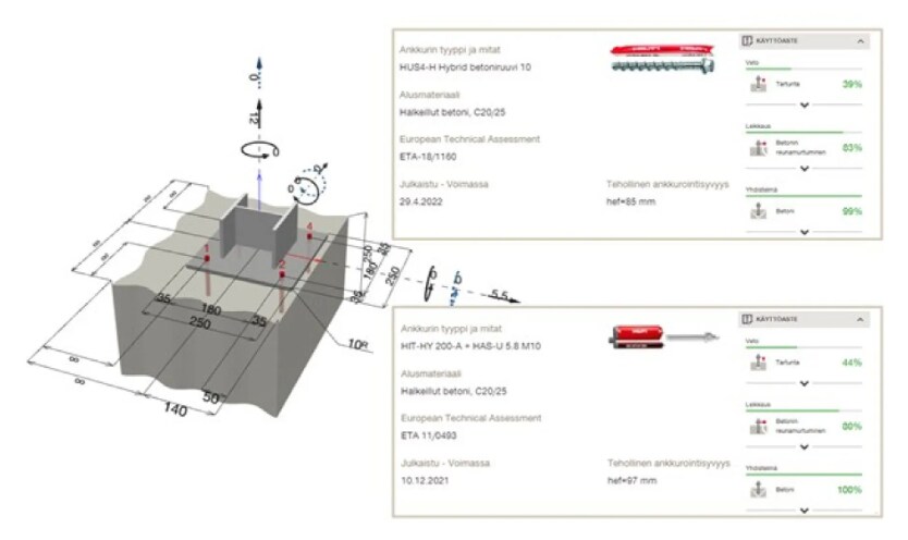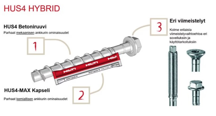 HUS4 Hybrid yhdistää mekaanisen ja kemiallisen ankkuroinnin. Kyseessä on yhdistelmätuote, joka muodostuu kahdesta osasta: HUS4-betoniruuvista ja HUS4-MAX-kapselista. HUS4 Hybrid on arvioitu EAD 332795 mukaisesti ja siltä löytyy laaja ETA-hyväksyntä kaikkiin tyypillisiin sovelluksiin, kuten myös erikoissovelluksiin. Kiinnitykset HUS4 Hybridillä voidaan suunnitella eurokoodipohjaisesti standardin EN 1992-4 mukaan ja suunnitteleminen onnistuu myös Hiltin selainpohjaisella PROFIS Engineering -ohjelmistolla. HUS4 Hybridin toiminta perustuu kiinnitysmekanismiin, joka yhdistää kemiallisen ja ruuviankkurin parhaat puolet. HUS4-betoniruuvin kierre leikkautuu betoniin ja HUS4-MAX-kapselin sisältämä massa täyttää mikrohalkeamat, jolloin pystytään hyödyntämään koko ankkurointipituutta ja kasvattamaan kartiomurron kapasiteettia. Käytännössä tämä tarkoittaa, että HUS4 hybridin kapasiteetti on jopa 30 % korkeampi kuin pelkällä betoniruuvilla eli kapasiteetiltaan se yltää kemiallisen ankkurin tasolle. Suunnitteluun HUS4 Hybrid tarjoaa joustavuutta pienillä reuna- ja keskiöetäisyyksillä. Kemiallisen ankkurin tavoin HUS4 Hybridin sisältämä massa tiivistää porareiän estäen veden pääsyn reikään. Tuote sopii käytettäväksi sovelluksissa, jossa on tarve suojata ankkuria korroosiolta tai vaaditaan muusta syystä tiivistä porareikää. HUS4 Hybridille löytyy myös WHG-hyväksyntä päällystetyille lattioille.